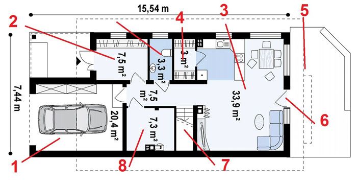 - El espacio común de la cocina / sala / comedor (3) es una técnica arquitectónica típica para proyectos de casas de un piso. Le permite combinar varias áreas funcionales en un volumen. Además de ahorrar espacio para tabiques, se obtiene un gran espacio libre.