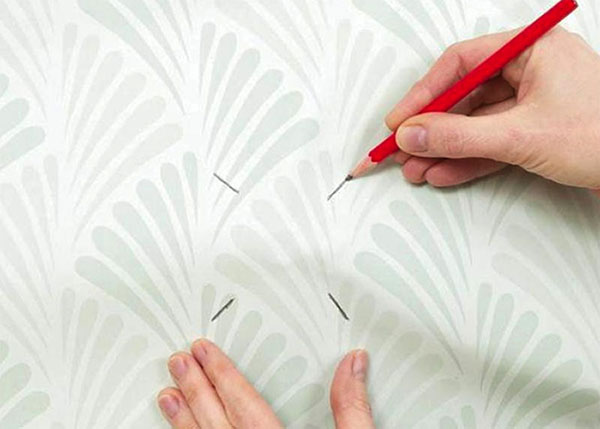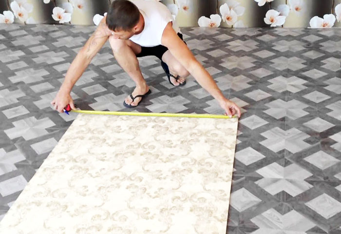 Ролката може да се нарязва на ленти, като се отчита височината и надбавката от 5 см. Това се отнася за случаите с едноцветен вариант, който не е особено взискателен за напасване на шарката. Трябва да застанете на стълба, да прикрепите ръба на ролката към фугата и да я развиете. С нож за тапет или молив направете бележка отдолу, покрай която се прави разрезът.