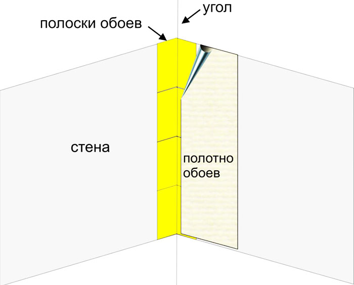 В ъгъла на панела е залепено припокриване, което е 2-3 см, поради което е по-добре да не се използва цяла лента за това. Следващата лента се поставя на друга стена и припокриването се изрязва с нож по вертикалния ъгъл.