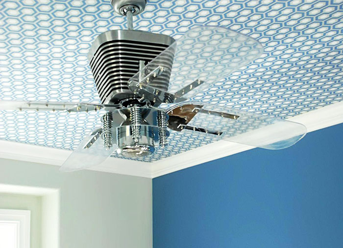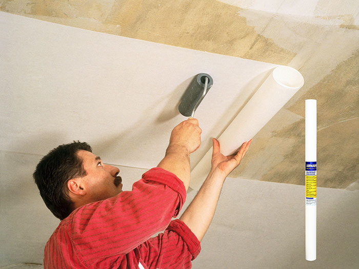 Листът се поставя отгоре на тавана, като постепенно се разтяга надолу. Връзката може да се подобри чрез движение с мистрия, притискайки излишното лепило към празната стена. Ако текстурата на тапета е дълбока, използвайте валяк.