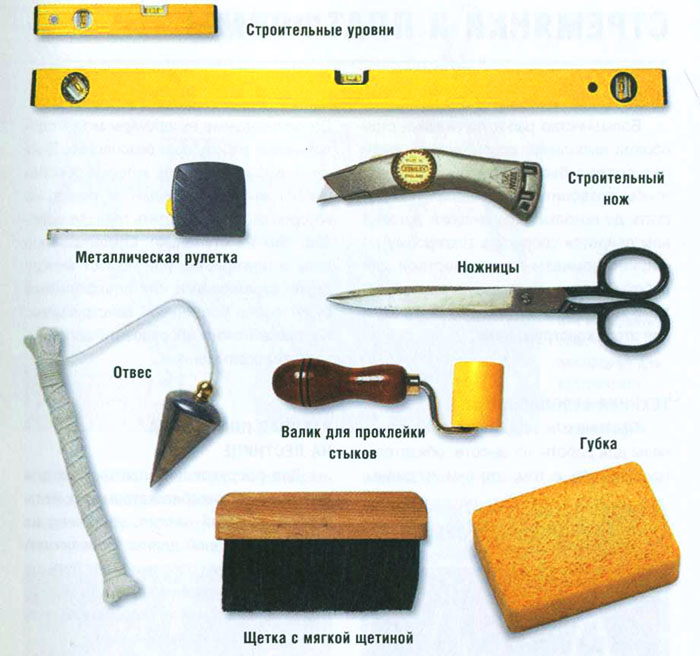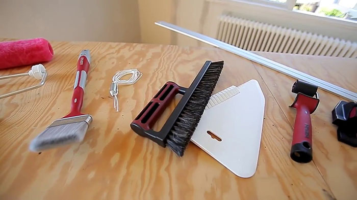 Първият етап на поставяне е подготвителен: трябва да закупите не само самите ролки, но и да залепите с инструменти за работа, да почистите и, ако е необходимо, да изравните стените, да изрежете лентите и да разредете лепилото.
