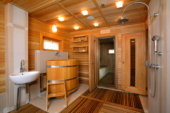 La décoration intérieure mérite une attention particulière. Le matériau le plus approprié est le bois. Pas une mauvaise solution et une option économique - doublure.La décoration murale doit être réalisée dans des couleurs pastel. Cela vaut la peine de considérer le sol dans la baignoire.