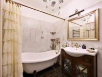 La décoration murale est très importante, dans laquelle les carreaux de céramique sont rarement utilisés. Peinture ou papier peint, parfois mosaïque ordinaire. Mais la base est des accessoires. Par exemple, des lampes anciennes, des miroirs, des tables de chevet, des robinets antiques, tuyaux et raccords en cuivre les communications. Regardez les images ci-dessous et vous comprendrez immédiatement les traits distinctifs du style rétro.
