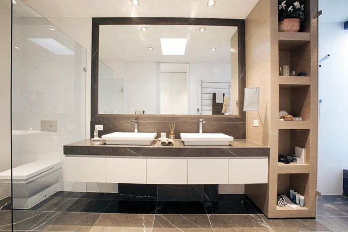 Le deuxième appareil de plomberie le plus important - évier... La conception de salle de bain moderne consiste à installer deux lavabos. Bien sûr, cette option d'agencement ne peut pas être utilisée dans tous les appartements de la ville, mais dans les maisons privées, en tenant compte des idées modernes de l'intérieur de la salle de bain 2019 (photo ci-dessous), deux bols ne sont pas seulement une approche originale, c'est une augmentation de la fonctionnalité de la pièce. À propos, le coût d'achat et d'installation de deux éviers est rapidement rentable en termes de commodité et de fonctionnalité. Et si une famille assez nombreuse vit dans la maison, cette option sera une bonne solution au problème des procédures d'eau du matin.