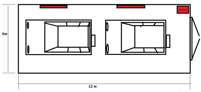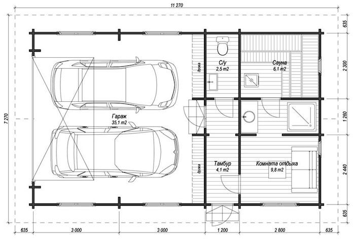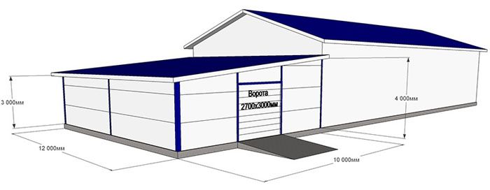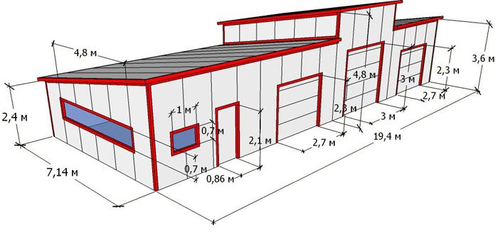 La longueur des murs est choisie de telle sorte qu'après avoir placé la voiture à l'intérieur, il reste une distance libre de 100-150 cm de tous les côtés.La solution standard est de 400 × 600 cm avec une largeur de porte de 2,4-2,7 m.