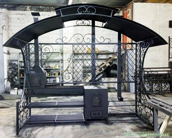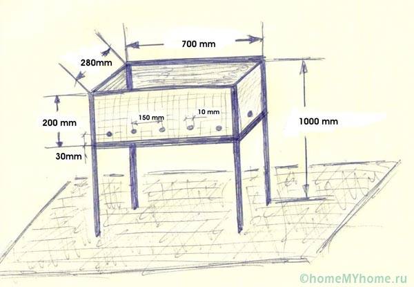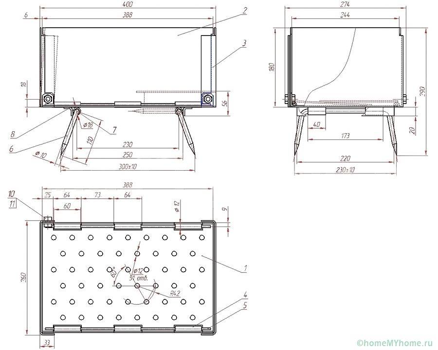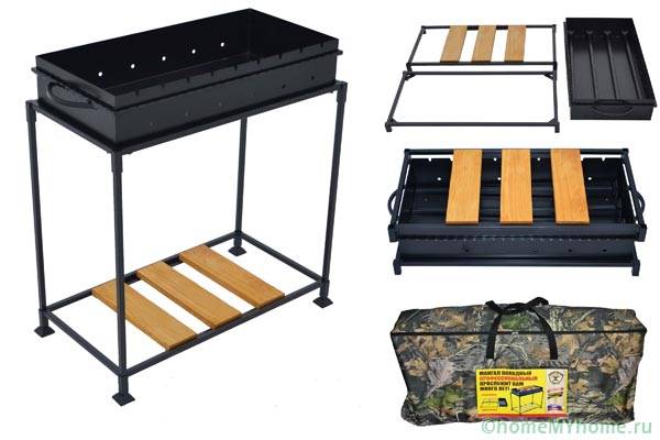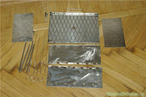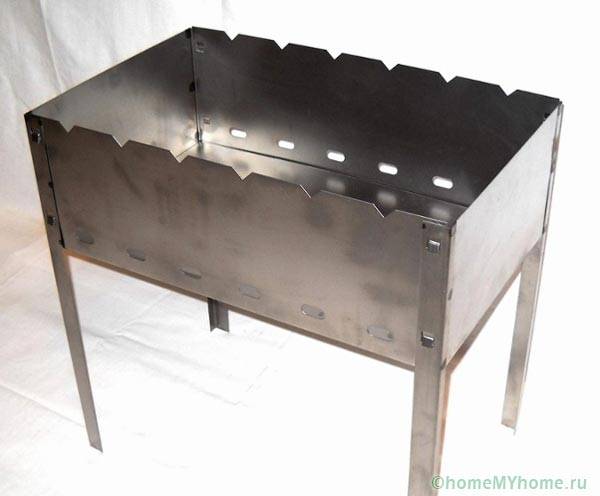 Un cadre de 0,3 x 0,9 m est soudé à partir du coin, le fond est posé à l'intérieur, attaché à des punaises. Les longues parois latérales sont fixées pivotantes au cadre (2 boucles de chaque côté), comportent deux rangées de trous dans la partie inférieure pour la traction, des fentes en haut pour les brochettes. Ils sont pliés au moment du transport, inclinés pendant la cuisson.