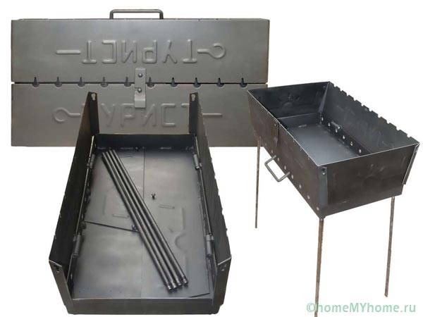 Il existe des barbecues mobiles à faire soi-même en métal, la taille des foyers et le design peuvent différer considérablement. Par exemple, nous considérerons deux modifications majeures dans le classement - une «valise» de type transformable et un brasier classique entièrement pliable.