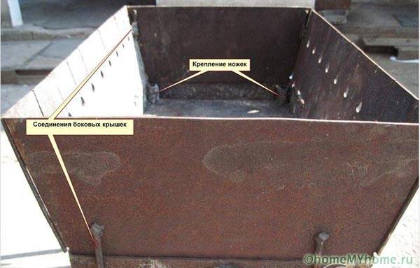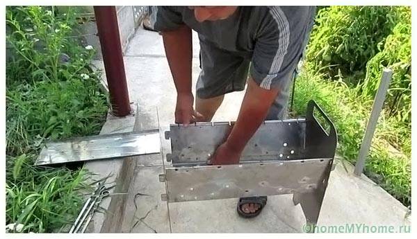 Pour fixer les éléments du barbecue les uns par rapport aux autres, une perforation en forme de V a été créée dans les pieds, les parois latérales, pliée vers l'extérieur (réalisée avec un ciseau, pliée avec une pince). Les feuilles latérales sont insérées en alternance avec des pinces pliées perforées dans les jambes du brasier. La rigidité finale de la structure n'est obtenue qu'après la pose du brasier.