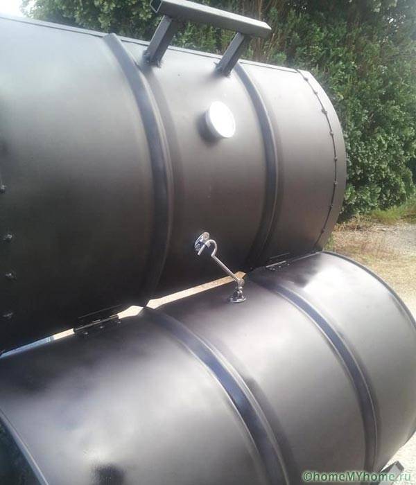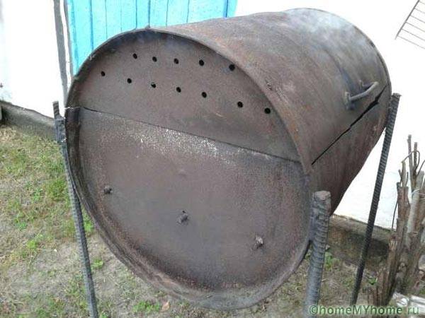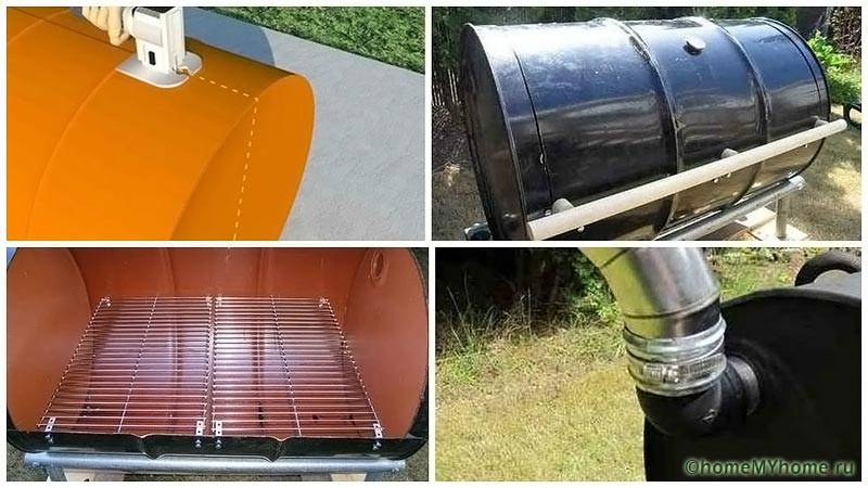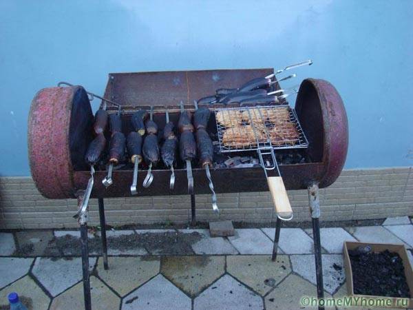 Les brochettes sont placées dans les coupes faites par les meuleuses d'angle. Des trous sont percés le long des extrémités du canon sous le brasier pour fournir une traction. Le fonctionnement avec une trappe fermée est également possible sans tuyau - pour cela, il suffit d'ajouter des trous dans la partie supérieure (motif en damier, diamètre à partir de 1 cm).