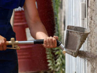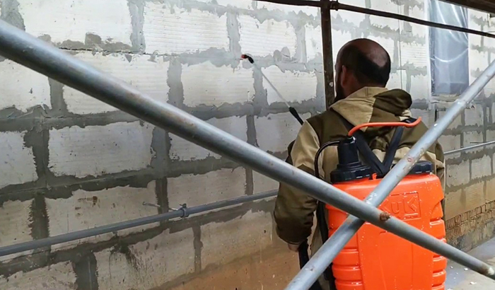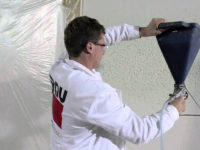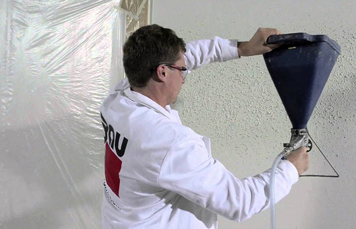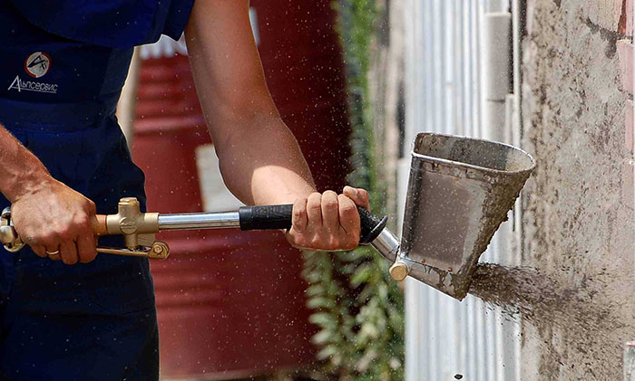 Le processus de plâtrage est simple et ne nécessite pas de formation préalable approfondie. Le mortier de plâtre prémélangé est ramassé avec une louche. La trémie est amenée au mur à une distance de 10 à 15 cm, puis l'alimentation en air comprimé est activée.