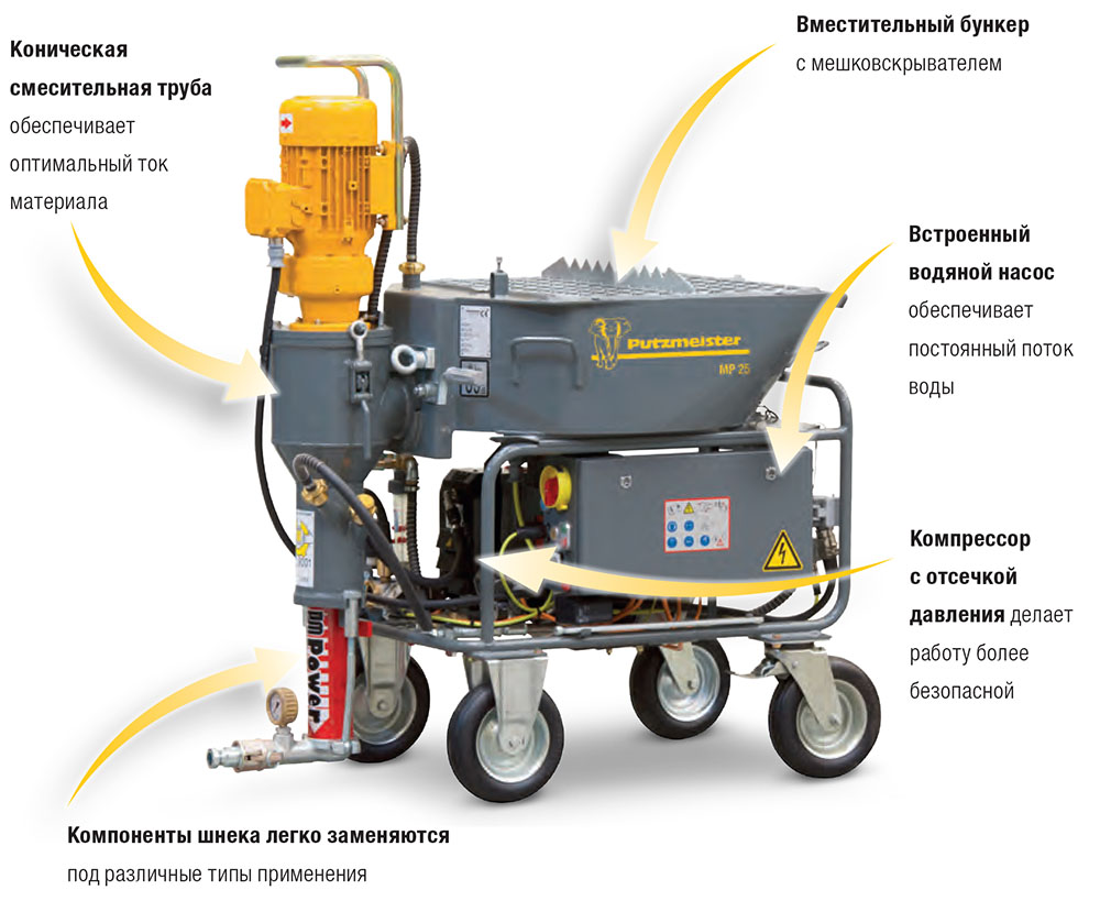 - Coût élevé de l'équipement. Ce sont des stations de plâtrage de haute technologie. Des moyens de mécanisation plus simples, comme un godet à trémie, sont beaucoup moins chers. Mais leur productivité n'est pas beaucoup plus élevée que celle d'un maître plâtrier.
