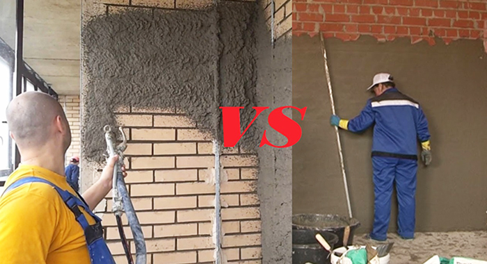Lors de l'application manuelle de mélanges de plâtre sur la surface de travail, la pression requise pour l'adhérence entre la finition et le mur est fournie par le plâtrier. Avec la méthode d'application mécanisée (machine), le mortier de plâtre est fourni sous la pression nécessaire pour une distribution uniforme sur la surface avec la création de l'adhérence requise.