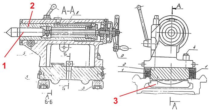 Lors de l'assemblage de cet appareil, une attention particulière doit être accordée à la précision du placement des axes centraux de la broche (1) et de la douille (2). En cas d'erreur, des surfaces coniques seront obtenues au lieu de cylindriques lors de l'usinage des pièces. Vérifiez également le parallélisme de ces éléments avec le tuyau de circulation. La barre de support (3) empêche la poupée mobile de se déplier. Pour le réglage de la hauteur, des entretoises en acier peuvent être utilisées.