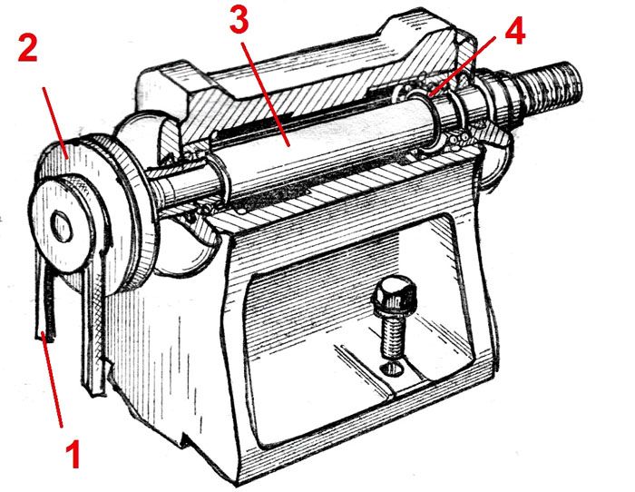 Un entraînement par courroie (1) est utilisé ici, qui se caractérise par un faible coût et un faible niveau sonore. Une double poulie (2) est installée pour un changement progressif de couple. Pour prolonger la durée de vie de la broche (3), une paire de roulements à billes doit être utilisée. Si nécessaire, des trous sont réalisés dans le boîtier pour un remplissage périodique de graisse.