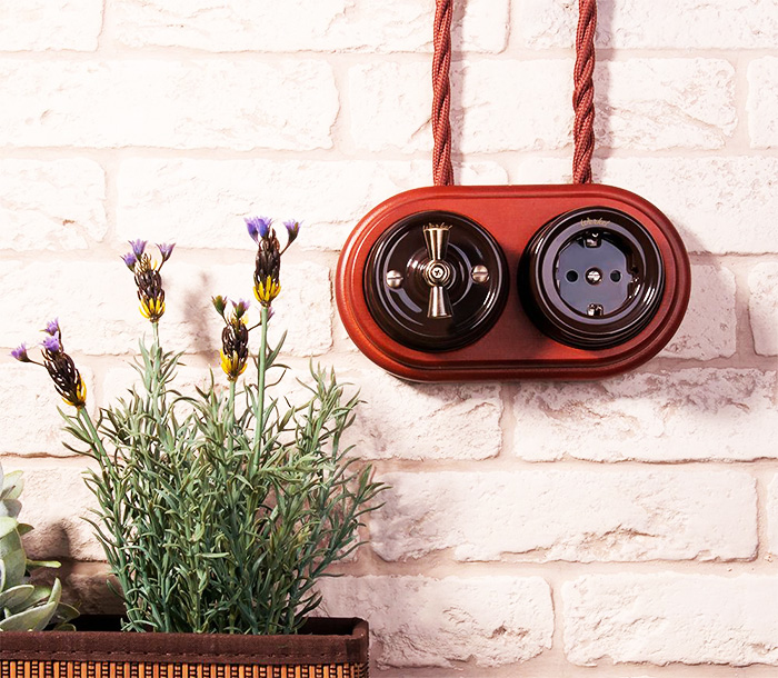 La pose de câbles ouverts anciens est typique pour l'intérieur Styles provençaux, country et shabby chic. En outre, certains éléments de câblage vintage, tels que les prises, les interrupteurs et les boîtes de jonction externes, sont également utilisés pour une installation dissimulée dans les styles Art nouveau et victorien.