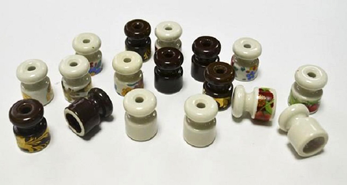 Le câblage rétro extérieur dans une maison en bois est fixé aux murs avec des isolants spéciaux. Ils ressemblent à de petits cylindres en relief avec un diamètre de base de 18 à 22 mm et une hauteur de 18 à 24 mm. La partie supérieure - la "tête" peut être étroite pour le montage d'un câble à deux conducteurs et large pour un câble à trois conducteurs. Matériel de fabrication - plastique ou porcelaine. La fixation au mur est réalisée à travers le trou au centre avec des vis ordinaires ou décoratives.