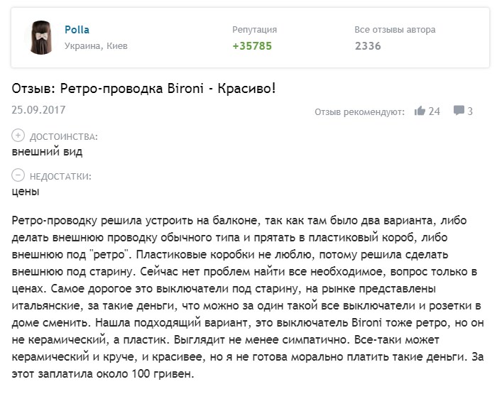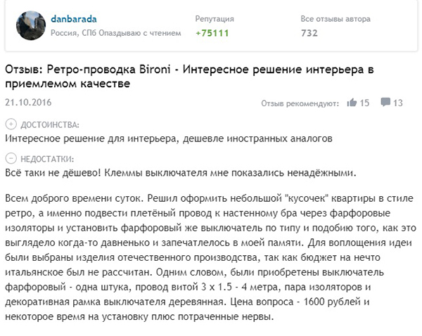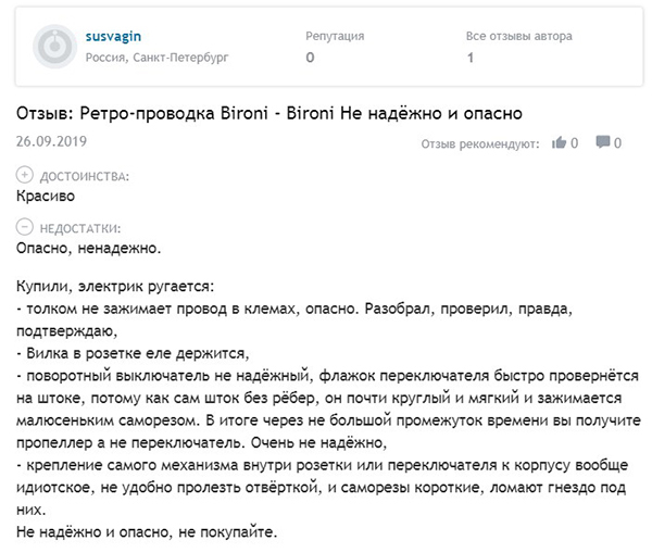 Les fabricants russes sont beaucoup moins représentés. Les entreprises dignes comprennent Lindasdont les produits ne sont pas de qualité inférieure aux éléments de câblage rétro Bironi... Les produits chinois sont largement représentés, mais la qualité de leurs produits est médiocre. Les avis les plus valables (quoique médiocres) ont été attribués aux produits Salvador.