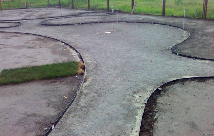 - Направете бордюр за запълване на писта в страната. Когато използвате фин чакъл или пясък за инсталиране на пътеки на площадката, те трябва да бъдат защитени от ерозия и пълзене. За това се използва лентата.