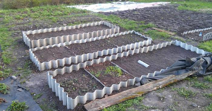 - Опция за шисти - добър начин за събиране на равномерни легла. Материалът е на достъпна цена и често във фермата има остатъци от парчета от покрива на покрива. Може да бъде гладка или вълнообразна. Но не издържа на механично напрежение. Например, ако случайно ударите такава ограда с лопата, тя ще се разцепи.