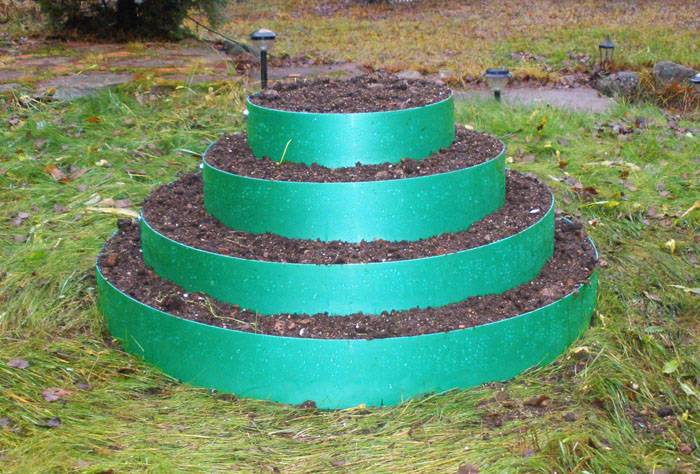 Лесно е да закупите пластмасова граница за градински легла във всеки град. В същото време няма да похарчите повече от 500 рубли. дори за най-цветните варианти на панделка. Такъв гъвкав материал се използва за различни цели в летни вили и дворове: