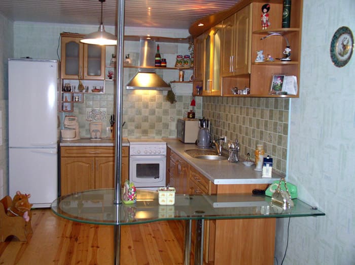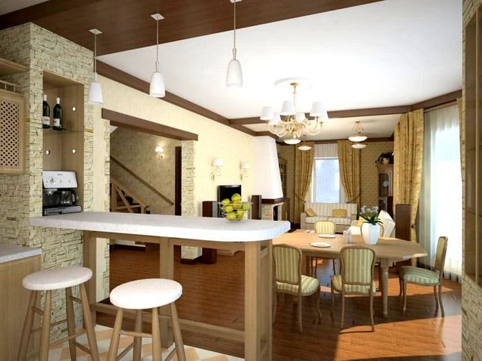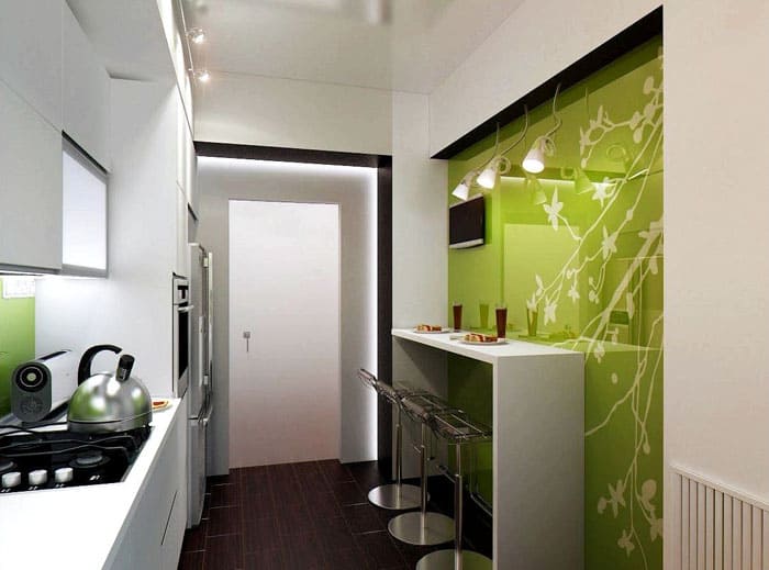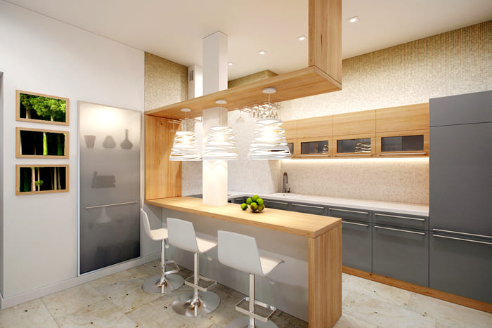 È abbastanza popolare posizionare il bar in cucina contro il muro. Vediamo quanto è interessante questa soluzione.