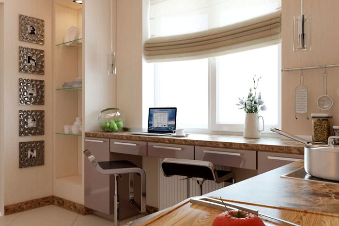 Vicino alla finestra, l'alterazione del davanzale della finestra sotto il bar sembra interessante. È sufficiente cambiare il piano del tavolo, attaccare 1-2 supporti e acquistare un paio di sedie adatte. Ci sono molte persone a un tavolo del genere, è difficile sottovalutare una tale decisione.