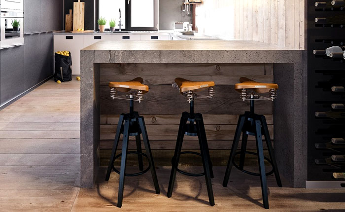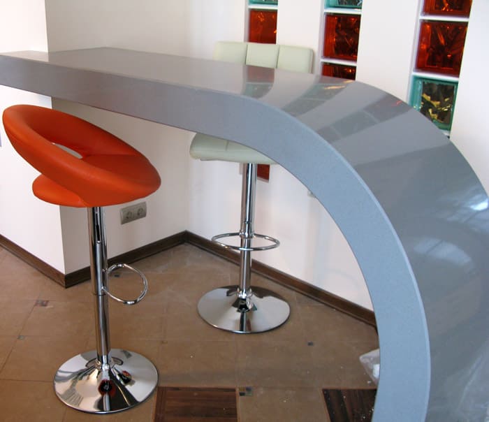 Studiamo di cosa sono fatti i banconi da bar in un appartamento. Truciolare laminato è in testa alla lista dei materiali, poiché questo materiale è disponibile in varie versioni, dall'imitazione di una pietra a soluzioni molto insolite. Il prezzo di tali prodotti sarà inferiore e il materiale per la fabbricazione della cucina sarà di qualità adeguata. La forza non è molto alta, il che è uno svantaggio di tali prodotti.