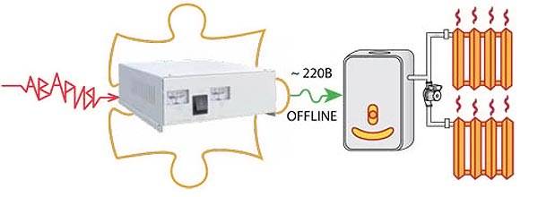 Rispetto al primo tipo hanno una tensione interna inferiore, per il loro funzionamento sono necessarie da 1 a 4 batterie. Il periodo di passaggio a loro durerà da 4 a 10 ms. Se la caldaia non dispone di un sistema di commutazione automatizzato dopo la comparsa di tensione nella rete, questo tipo non funzionerà. È più economico perché l'unità stessa è poco costosa e richiede meno batterie per funzionare. Ma in questo caso, devi acquistare un altro dispositivo, vale a dire: Regolatore di tensione... Questo tipo è più spesso utilizzato per caldaie a combustibile solido e pompe di circolazione in altri tipi.