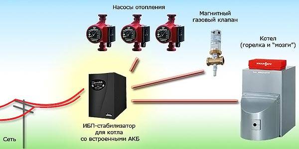 Il funzionamento come fonte di alimentazione ausiliaria è possibile poiché l'UPS può immagazzinare energia durante la carica e quindi rilasciarla secondo necessità. Il design del dispositivo implica autonomia e un minimo di impostazioni: deve solo essere collegato alla caldaia. Ininterrotto per caldaie per riscaldamento a gas, che ora sono più comuni, è necessario solo per mantenere il funzionamento della pompa, il cui consumo è minimo. Questa cifra varia da 100-200 watt. La batteria dell'UPS ha un impatto significativo, dal quale il periodo di funzionamento dipenderà completamente da un'interruzione di corrente.