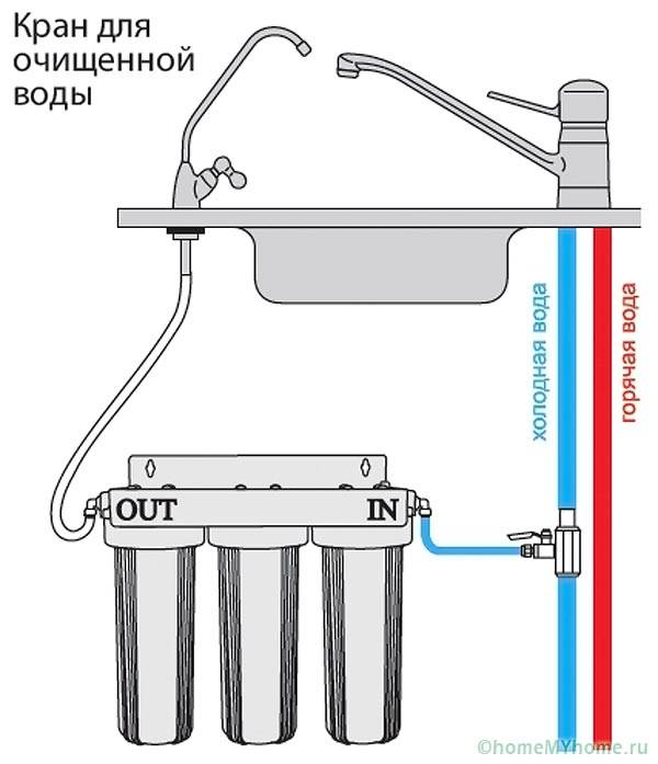 In qualsiasi luogo conveniente, il lavandino è perforato, un rubinetto è collegato al foro, a cui è collegata l'uscita dell'attrezzatura di filtrazione. L'industria produce miscelatori con più modalità di flusso.