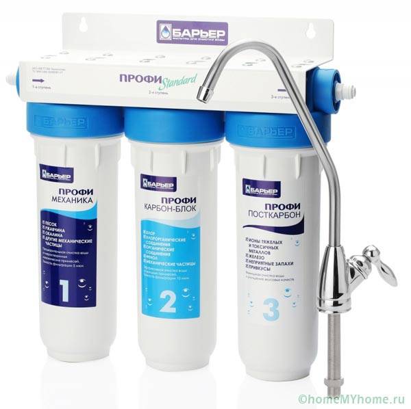 - Barriera CE - prezzo entro 3,2 mila rubli, produttività 2 litri al minuto, pulizia in tre fasi (rete, adsorbente, addolcimento e deferrizzazione), risorsa 10.000 litri;