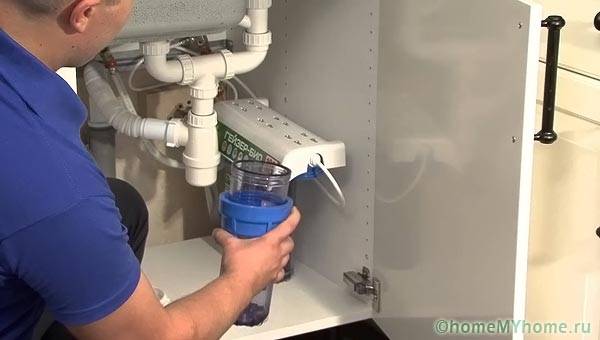 Dopo aver determinato per condizioni operative specifiche quali filtri dell'acqua sono migliori per il lavaggio e il fissaggio delle apparecchiature all'interno dell'armadio, è necessario collegare i flaconi nella sequenza specificata. Per questo, vengono utilizzati i tubi del tubo inclusi nel kit, che vengono messi sugli ugelli dopo aver rimosso i tappi. Dopodiché, è sufficiente attivare la valvola centrale, aprire dolcemente il rubinetto sul tee.