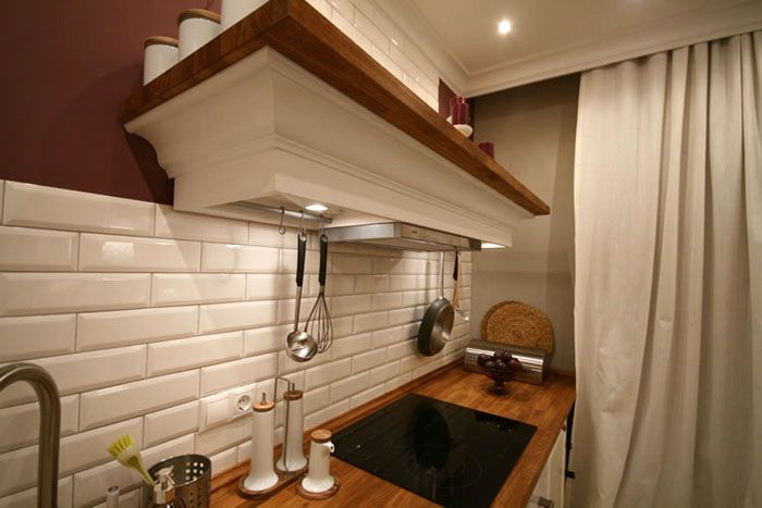 Ci può essere un gran numero di opzioni su come nascondere un condotto d'aria corrugato in cucina, come evidenziato dalle seguenti foto, che hanno registrato la soluzione a un problema simile da parte di progettisti e inquilini: