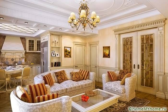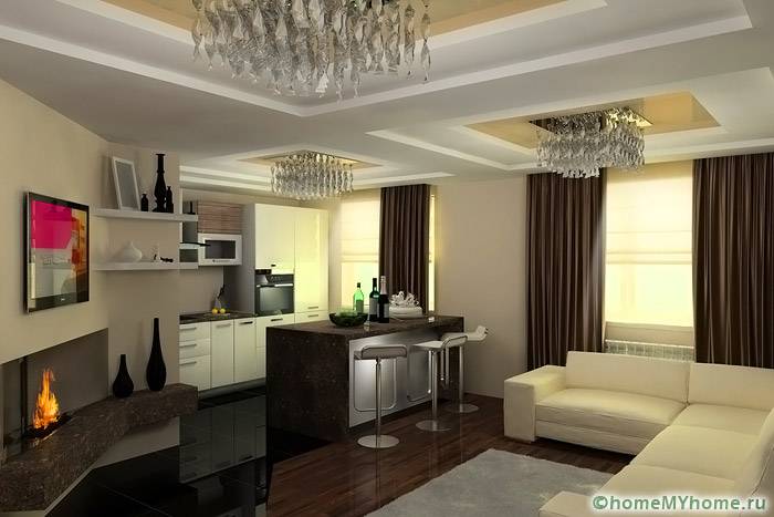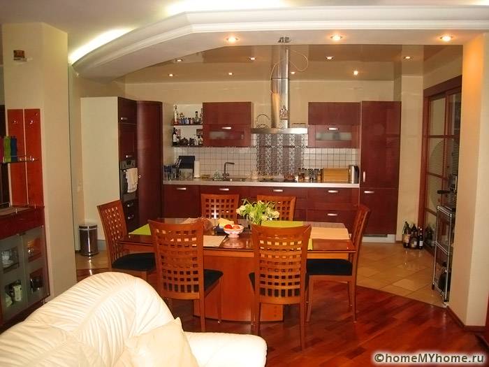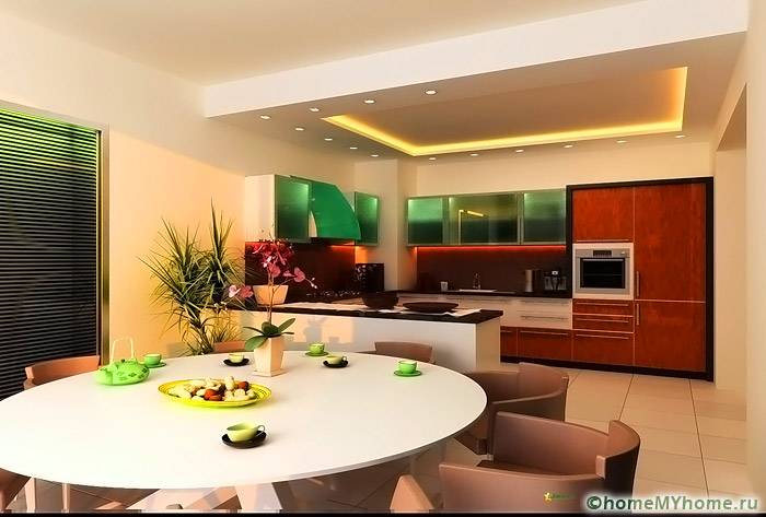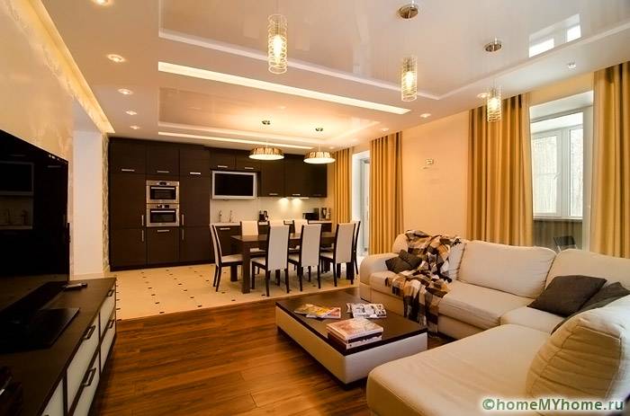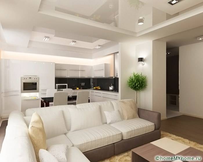 Il soggiorno, combinato con la cucina (un gran numero di foto sono presentate su Internet), è perfettamente suddiviso in zone utilizzando superfici multilivello. Tubi, fili e altre comunicazioni possono essere mascherati sotto un pavimento e un soffitto multilivello. L'uso di materiali lucidi per i rivestimenti dei soffitti può aumentare visivamente i soffitti ed espandere lo spazio