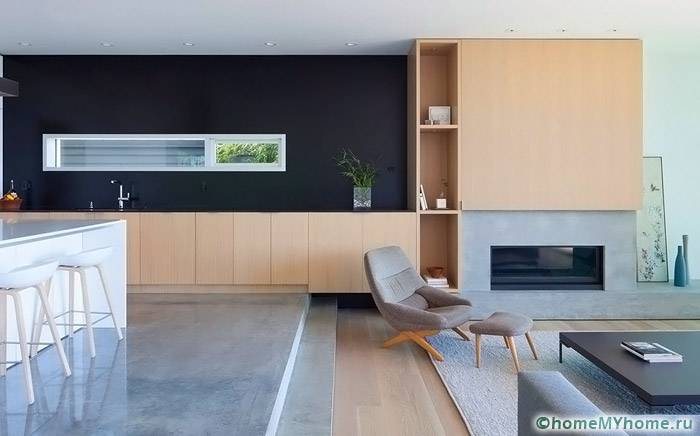Il pavimento del soggiorno può essere rifinito con linoleum, parquet o laminato.Diverse opzioni sono utilizzate per le pareti intonaci decorativi, carta da parati o persino vernice. Tali accenti aiuteranno a dividere visivamente una grande stanza in aree funzionali.
