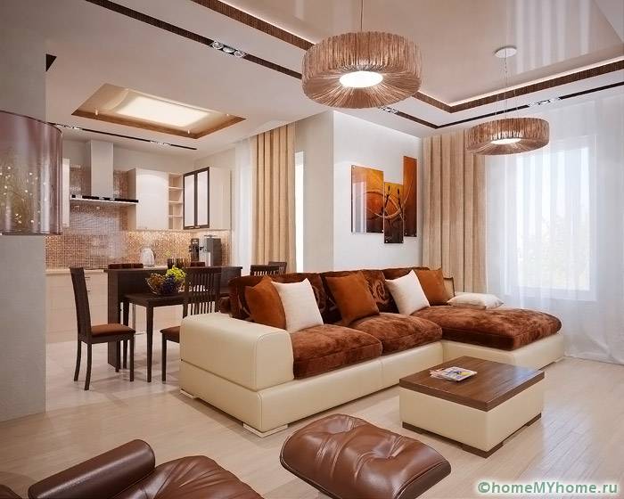 Soluzioni interessanti si possono vedere nella foto degli interni del soggiorno abbinati alla cucina. Il vantaggio principale di questo layout è l'ampliamento dell'area. Ulteriori metri possono essere liberati demolendo il muro. L'illuminazione migliorata è considerata un altro vantaggio di questo layout. Lo spazio combinato diventa più leggero aumentando il numero di finestre.