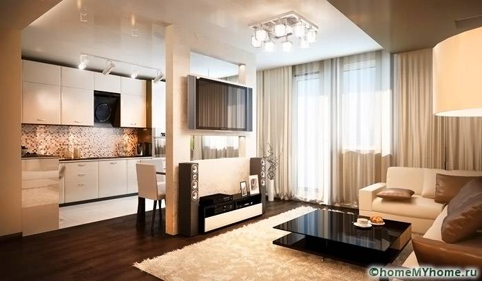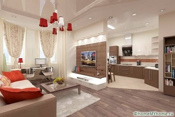 Informazioni utili! L'opzione stanza combinata è adatta per spazi lunghi e stretti. In questo caso lo spazio è suddiviso in aree funzionali.