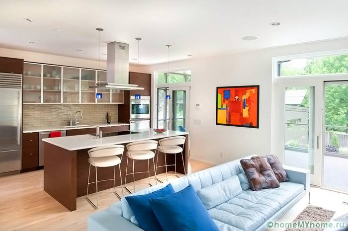 Gli svantaggi di un tale layout includono la perdita dell'opportunità di andare in pensione. Altri svantaggi includono gli odori. Tutti gli aromi del cibo cotto si diffonderanno in tutta la stanza. Inoltre, si diffonderanno fumo, vapore e fuliggine. Per risolvere il problema, vale la pena installare un potente cappuccio... Anche i suoni del lavaggio dei piatti, degli elettrodomestici e della cucina possono essere fastidiosi. Per attrezzare la cucina avrai bisogno mobiliasu misura per le dimensioni individuali.