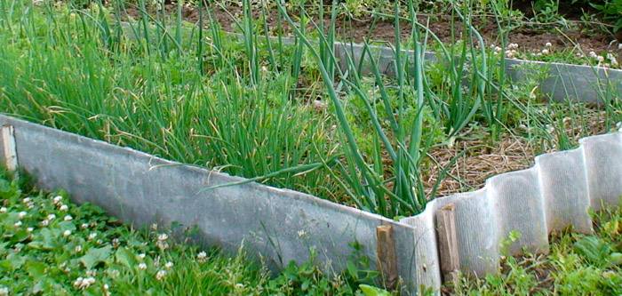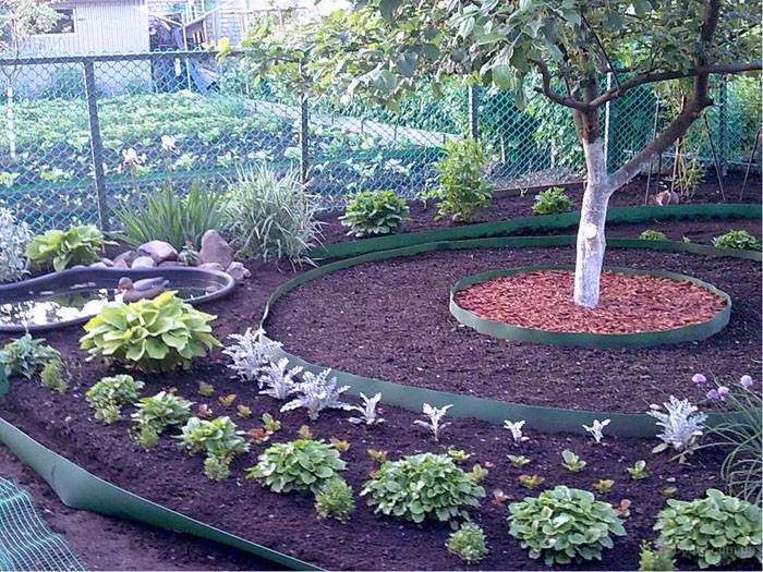 Le opzioni più semplici per la scherma, che non richiedono molto tempo e hanno un prezzo accessibile: ardesia piatta e nastro per cordoli. Nel secondo modo, puoi creare qualsiasi forma per piantare colture da frutto.
