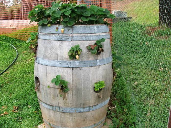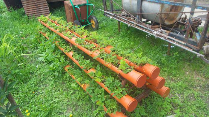 Piantare fragole in un tubo (orizzontalmente) è un'opzione comune nelle aree con poco spazio libero. Inoltre, il materiale stesso può essere sia metallo che PVC. Ecco alcuni esempi divertenti: