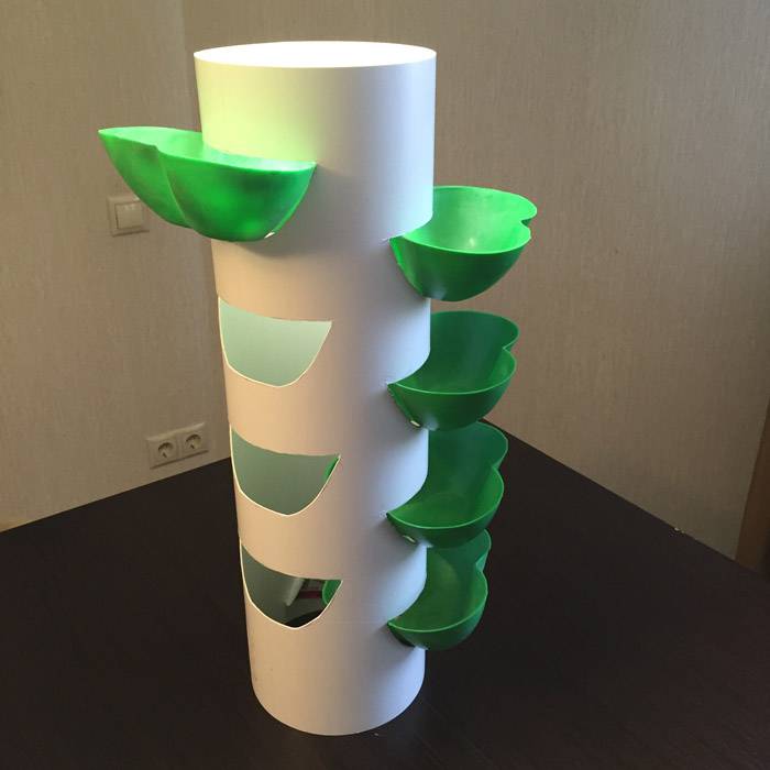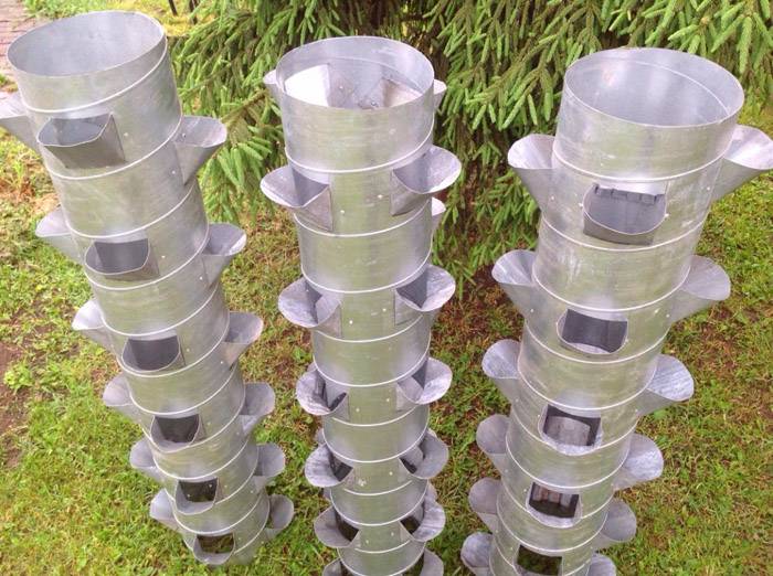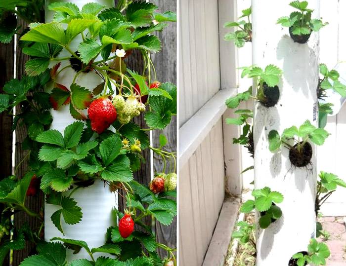 Disegni interessanti di letti verticali per fragole da tubi di plastica. Ecco alcuni esempi di foto: