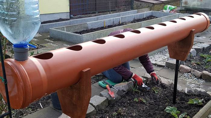 Quando il lavoro preparatorio è completato, assemblare la struttura. Per fare ciò, posizionare i tappi sui tubi. Approfondisci quello spesso nel terreno e un piccolo tubo di irrigazione è attaccato ad esso al centro. Il terreno viene riempito e vengono piantati cespugli. Per chiarire, guarda il video sull'argomento: