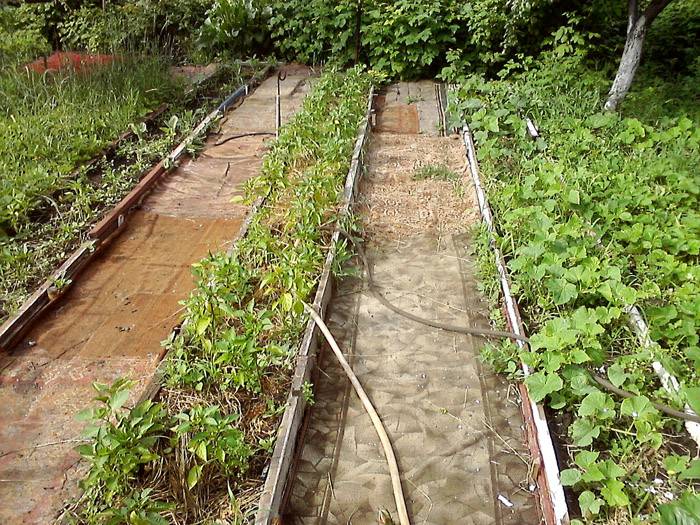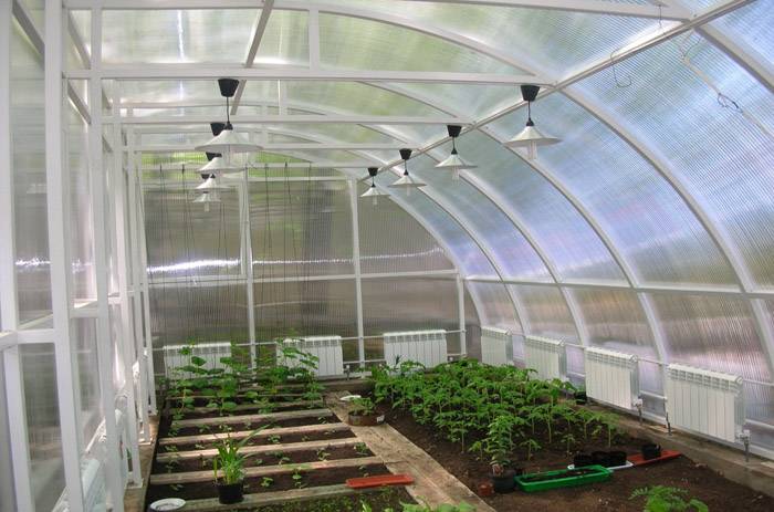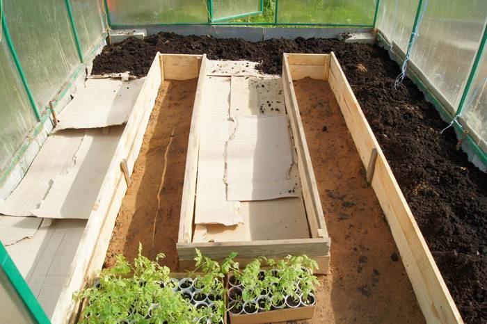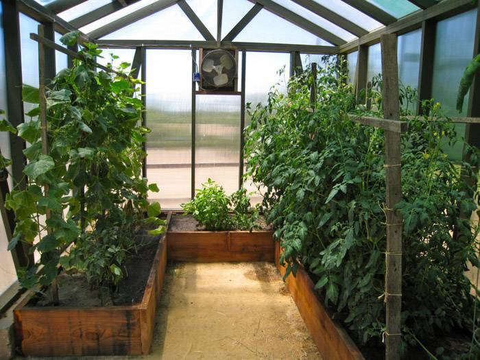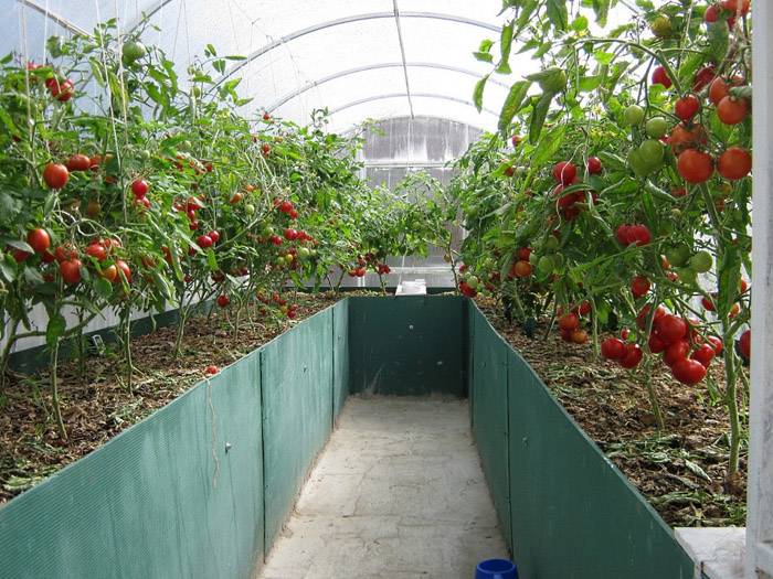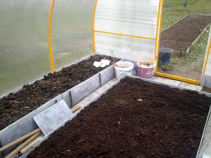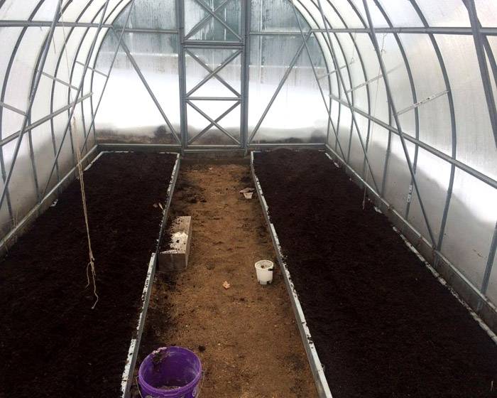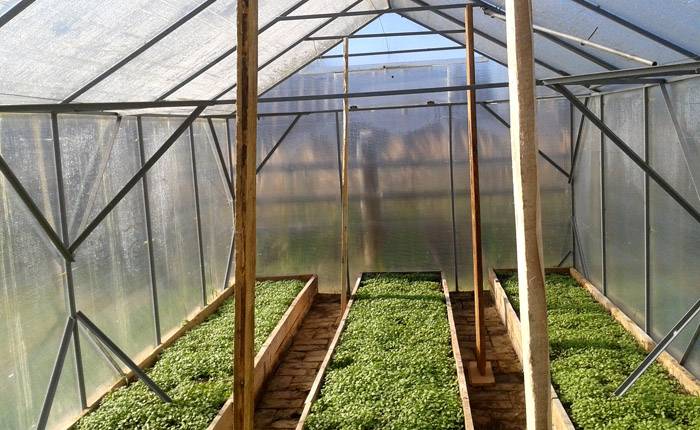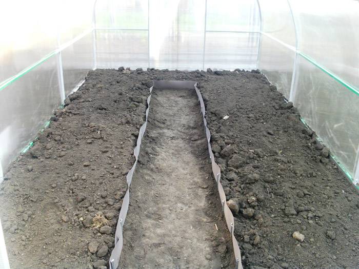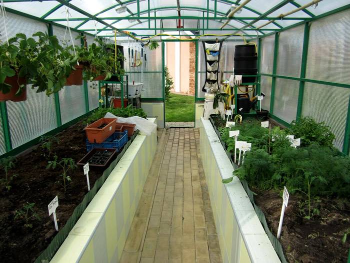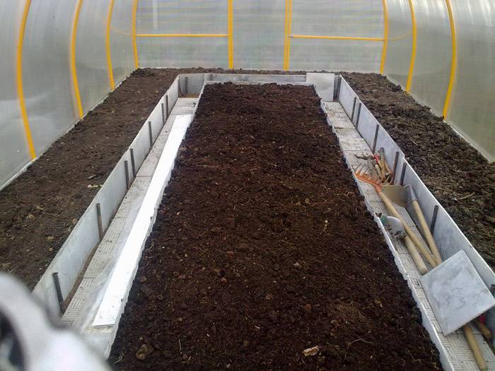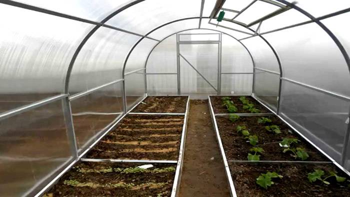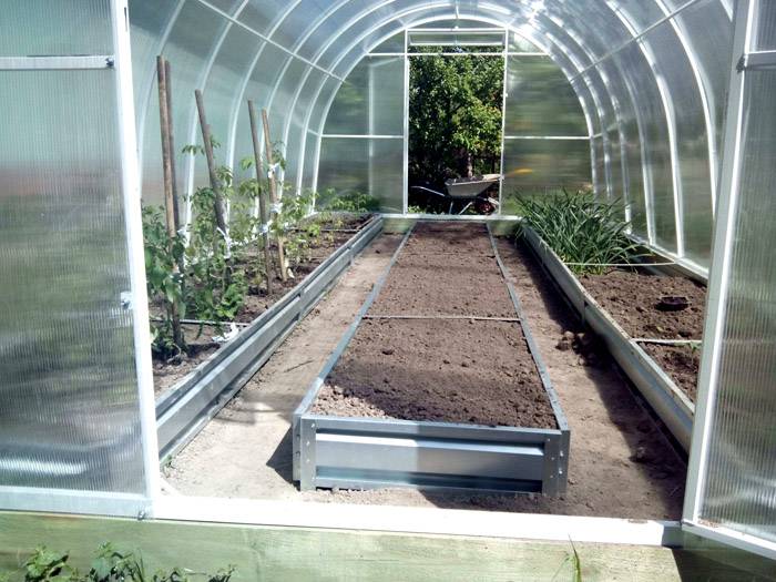 - Due letti lunghi larghi lungo le pareti della serra. Al centro c'è un passaggio con una larghezza di 50-70 cm, questa disposizione consente di piantare colture diverse, regolando la distanza tra loro e prendersi cura di loro con calma.