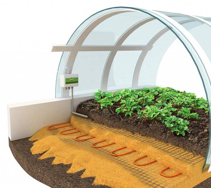 - Riscaldamento interno utilizzando un cavo elettrico. La temperatura all'interno della serra e nel terreno può essere controllata con precisione.
