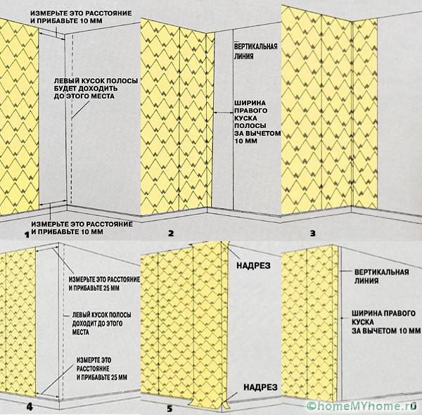 Gli angoli richiedono cure speciali. Quando la distanza dalla zona d'angolo è inferiore alla tela, il foglio viene tagliato con una sovrapposizione. Questa parte scivolerà sulla superficie della parete perpendicolare. Quindi il secondo strato viene sovrapposto. I fogli vengono fatti passare da un apposito rullo.