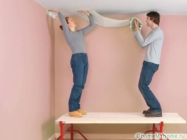 La superficie del soffitto deve essere incollata prima di incollare le pareti. In questo caso, vale la pena scegliere materiali più leggeri.Quando si elabora il soffitto, vale la pena estrarre tutti gli oggetti mobilia e tappeti. Se non è possibile estrarre gli oggetti, coprirli con pellicola trasparente.