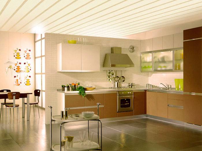 Si consiglia di utilizzare pannelli di plastica per la decorazione della cucina. In questo caso, l'assemblaggio viene eseguito con piccoli spazi vuoti. Le lamelle dovrebbero andare sotto i pensili e premere saldamente. I bordi inferiori sono fissati con battiscopa.