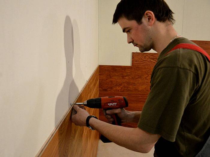 Quando si utilizzano chiodi liquidi, le piastre devono essere maschiate. Per un'adesione di alta qualità, la colla deve essere stagionata. Al termine dell'installazione vengono fissati i battiscopa del soffitto o del pavimento. Per fare ciò, utilizzare viti autofilettanti.