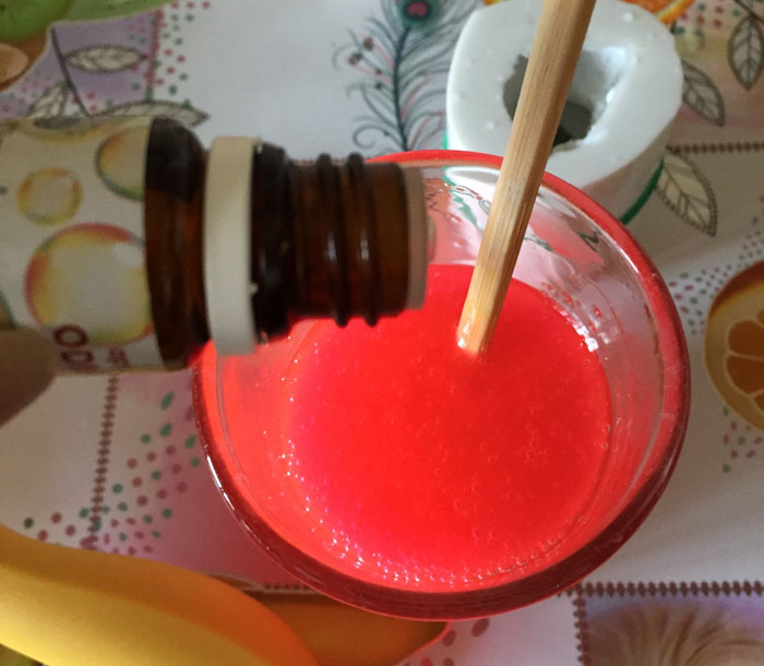 Ora aggiungi qualche goccia di aroma e mescola ancora per evitare che le particelle di caffè si depositino sul fondo. Ora puoi versare la massa nello stampo e cospargere il sapone con alcol.