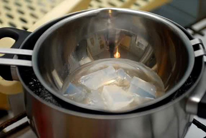 La massa di sapone risultante deve essere messa a bagnomaria, inoltre, l'acqua viene versata vicino al livello di massa della composizione. Accendi un piccolo fuoco e fai sobbollire la soluzione per 3-4 ore sotto un coperchio. L'acqua viene periodicamente aggiunta, una volta ogni mezz'ora.